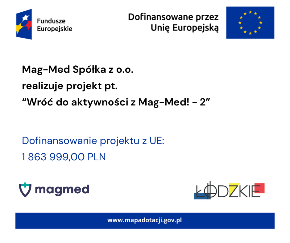 Z dumą informujemy, że projekt FELD.08.04-IZ.00-0005/25 – „Wróć do aktywności z Mag-Med - 2” realizowany przez MAG-MED w Łodzi, został wybrany do dofinansowania! Projekt dotyczy rehabilitacji leczniczej i obejmuje wdrożenie działań z zakresu rehabilitacji medycznej, które mają na celu ułatwienie powrotu do pracy oraz wsparcie w utrzymaniu aktywności zawodowej. Już wkrótce ruszamy z działaniami, które realnie pomagają odzyskać sprawność i pewność siebie. Szczegóły naboru i udziału w projekcie podamy niebawem!