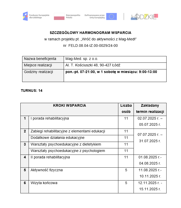 Szczegółowy harmonogram wsparcia dla czternastej tury w Projekcie "Wróć do aktywności z Mag-Med!"