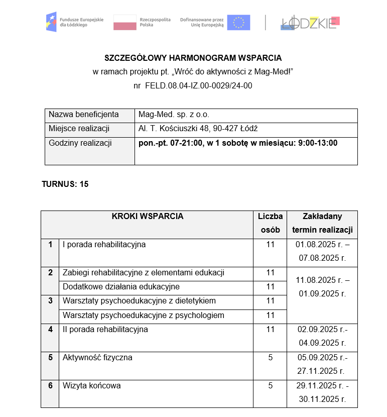 Szczegółowy harmonogram wsparcia dla XV GR w projekcie „Wróć do aktywności z Mag-Med!”