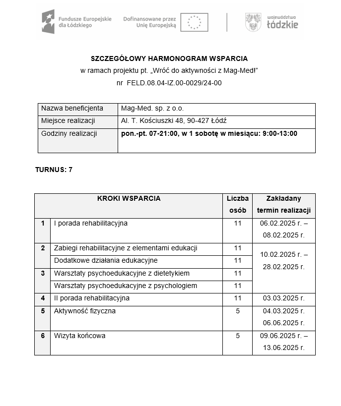 Szczegółowy harmonogram wsparcia w ramach projektu "Wróć do aktywności z Mag-Med!" Projekt nr FELD.08.04-IZ.00-0029/24-00 dofinansowany ze środków Unii Europejskiej. Poniżej znajdziecie harmonogram VII turnusu (11 osób) w naszym projekcie! Każdy etap wsparcia ma przypisany termin, dlatego zachęcamy do śledzenia, aby w pełni skorzystać z oferowanej rehabilitacji i powrotu do aktywności. Udział w projekcie jest całkowicie bezpłatny dzięki wsparciu ze środków UE!