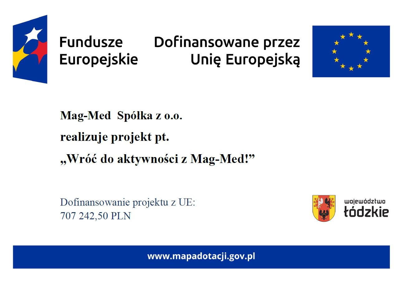 Projekt współfinansowany ze środków Europejskiego Funduszu Społecznego Plus w ramach programu regionalnego Fundusze Europejskie dla Łódzkiego 2021-2027, Priorytet 8 Fundusze europejskie dla edukacji i kadr w Łódzkiem, Działanie FELD.08.04 Zdrowy pracownik. Projekt realizowany jest w ramach „Programu rehabilitacji leczniczej dla mieszkańców WŁ w zakresie chorób narządów ruchu”.